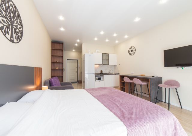 Апартаменты студия для 4 гостей. Есть все необходимое для комфортного проживания: чистое постельное белье, полотенца, мыльные принадлежности, фен, утюг, чайник, безлимитный w-fi, микроволновая печь, телевизор, стиральная машина, посуда.