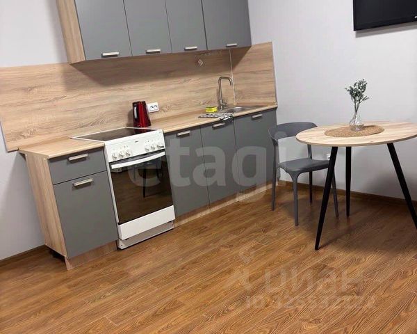 Укомплектована техникой и мебелью: Wi-Fi, стиральная машина, плита, холодильник, варочная панель, кондиционер, вытяжка, электрический чайник, обеденная зона, кухонный гарнитур, шкаф и диван