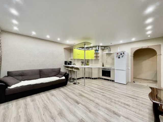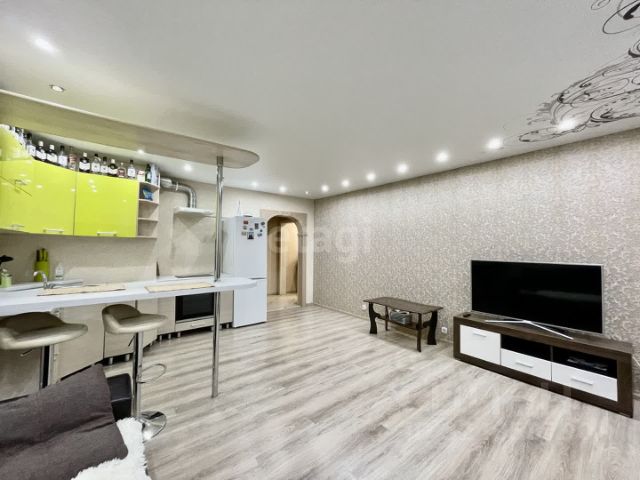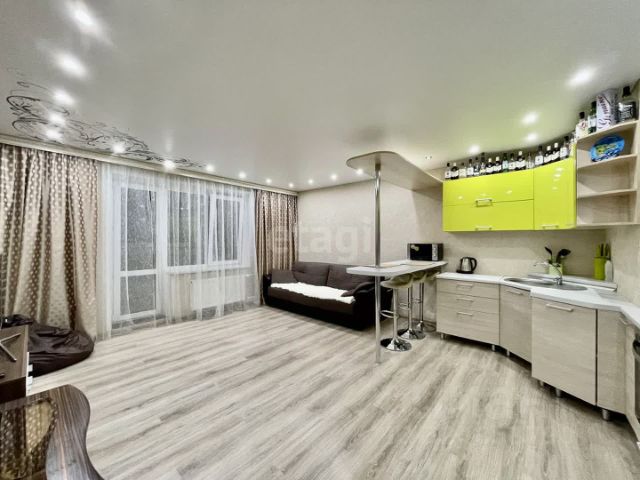 Гостиная: подсветка , кухня гостиная , барная стойка , телевизор , диван , пилон , крест БДСМ , журнальный стол , шкура натуральная.