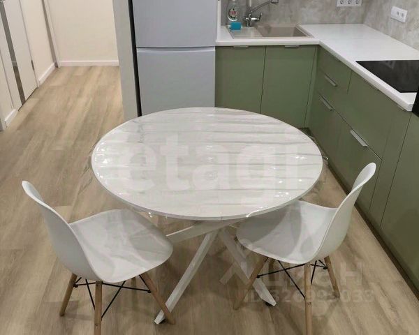 Кухня-гостиная: удобный раскладной диван, обеденный стол + 4 стула, современный кухонный гарнитур с духовкой и варочной панелью. Установлен мембранный фильтр для воды — можно пить из-под крана без кипячения. Есть холодильник. Кондиционер в этой же комнате — спасает в жару.