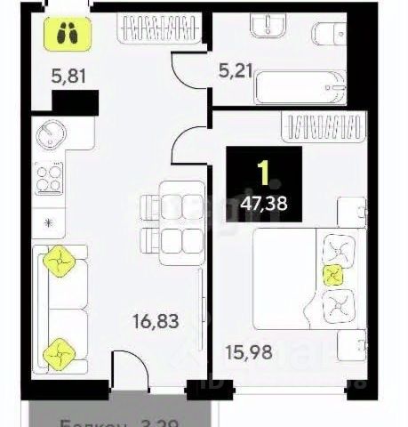 47,38 м² чистого комфорта. Отдельная спальня (можно уединиться, пока в гостиной идёт жизнь) + просторная кухня-гостиная. Такая планировка подходит и для работы из дома, и для приёма гостей.